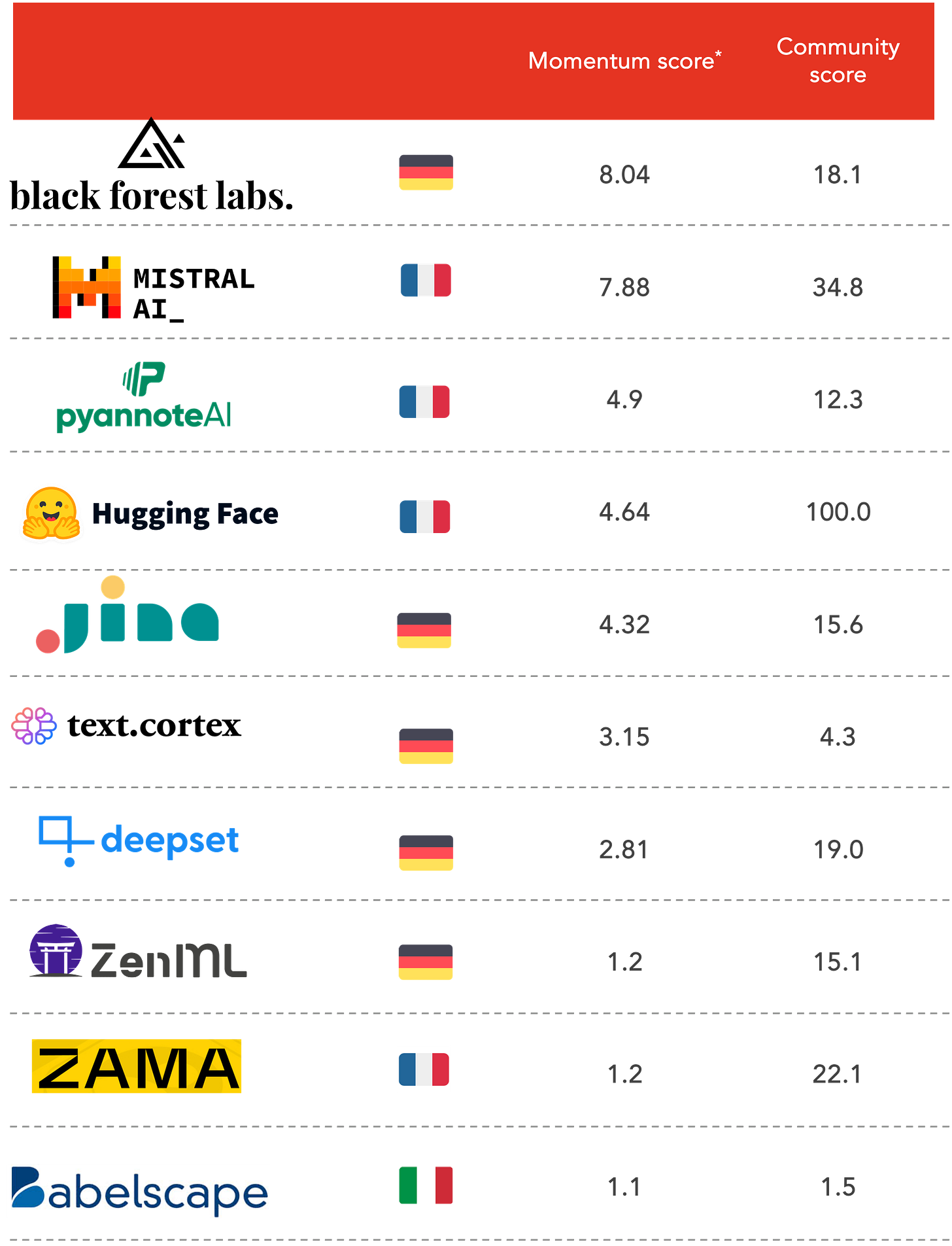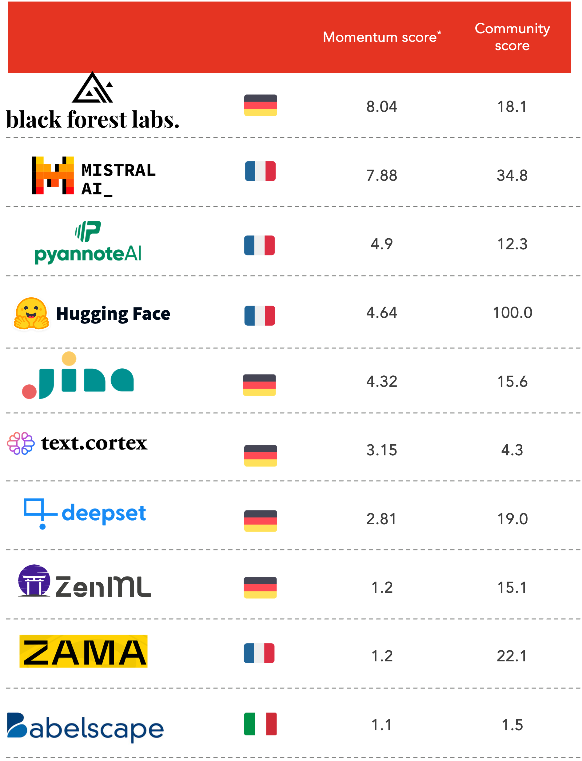 Europe's open source AI ecosystem is thriving, with companies pushing the boundaries of AI while fostering vibrant communities that drive innovation. This month's Top 10 list, curated through our proprietary RAMP platform, highlights the stars shaping the future of AI in Europe. Recent industry milestones underscore Europe's potential to lead the open source AI revolution, aligning with the belief that open source is key to technological sovereignty.